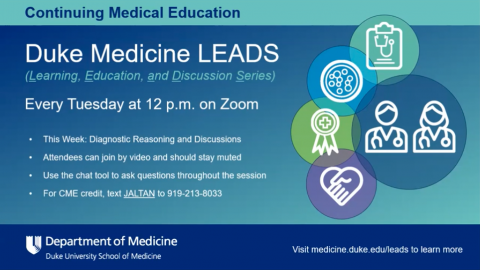 The January 25, 2022, session of Duke Medicine LEADS featured Amit Patel, MD, Caroline Sloan, MD, Gabriela M. Maradiaga Panayotti, MD, and Daniella Zipkin, MD presenting "Patient Advocacy and Involvement in Governmental Affairs."