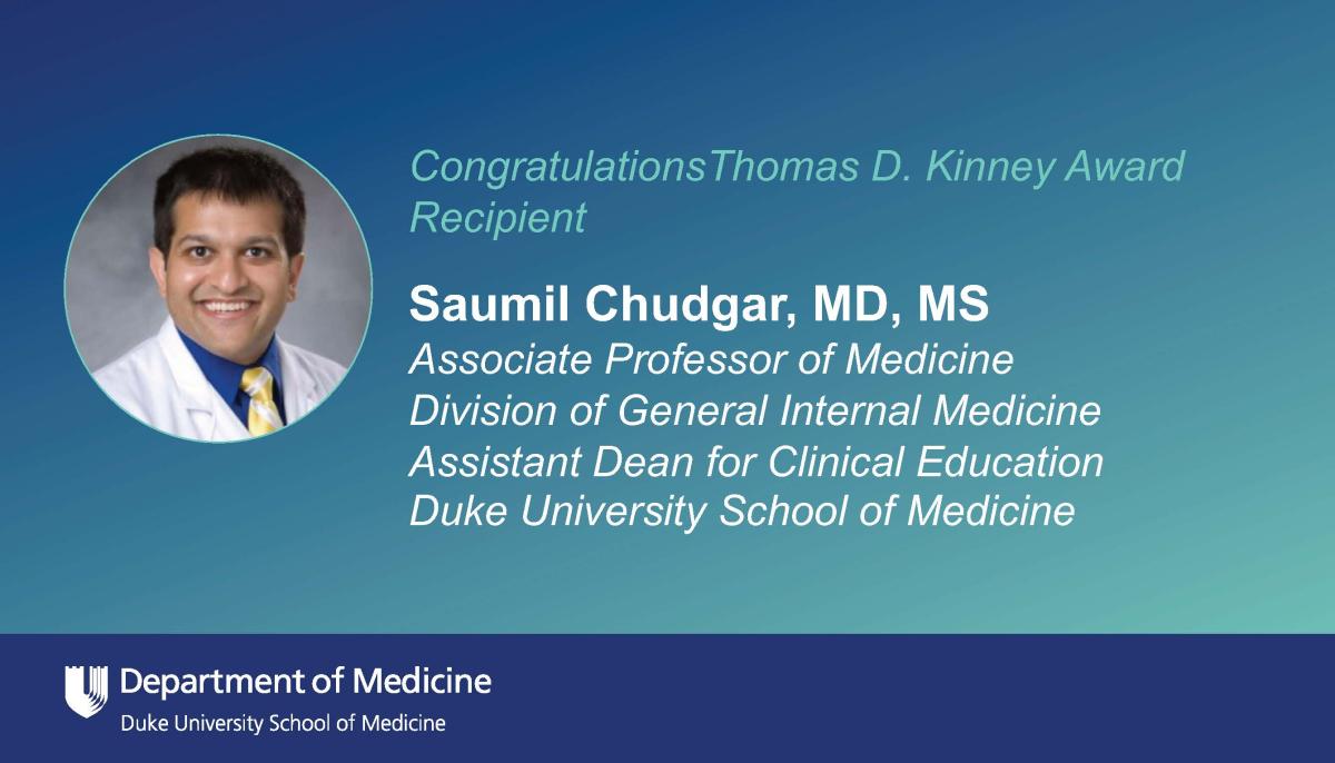 Saumil Chudgar, MD, MS, was selected by the Duke University School of Medicine Class of 2021 as the recipient of the Thomas D. Kinney Award.