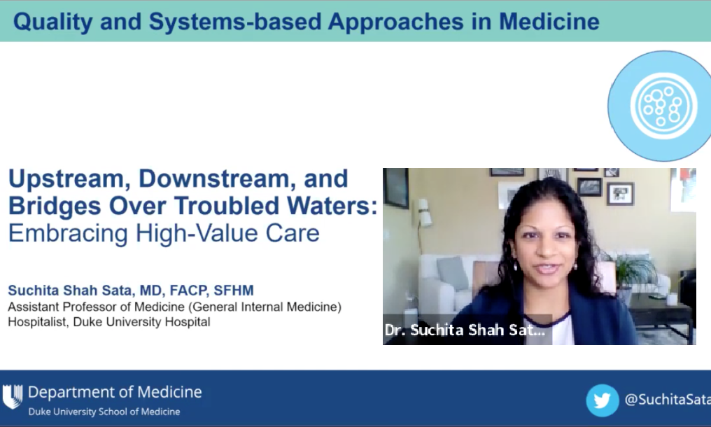 The April 20, 2021 session of Duke Medicine LEADS featured Suchita Shah Sata, MD, FACP, SFHM, presenting, "Upstream, Downstream, and Bridges Over Troubled Waters: Embracing High-Value Care."