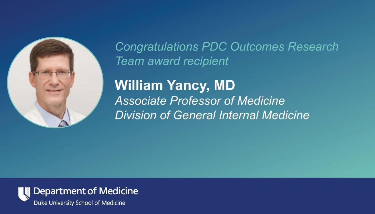 William Yancy, MD, has received an award from the PDC Outcomes Research Team (PORT) for his project "An Evaluation of Duke Weight Management Programs to Inform Development of a Collaborative Center."