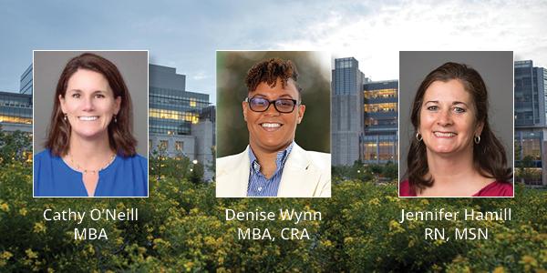 Cathy O’Neill, MBA, assumes the role of director, Clinical Operations Integration, for the department. Denise Y. Wynn, MBA, CRA, has been named director, Basic Research Administration, and Jennifer M. Hamill, RN, MSN, has been promoted to director of Clinical Research Administration in the department’s Clinical Research Unit.