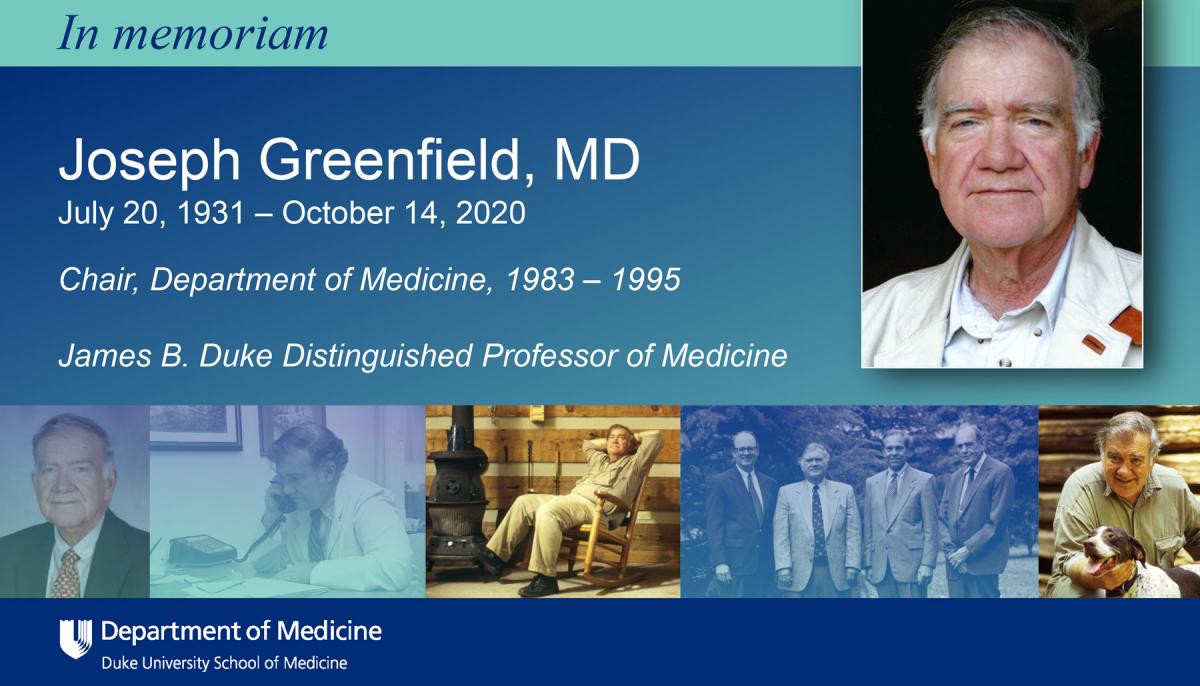 Joseph Greenfield, MD, James B. Duke Distinguished Professor of Medicine and chair of the Department of Medicine from 1983 to 1995, died on Wed., Oct. 14, 2020. He was 89. Dr. Greenfield was passionately committed to the professional development of faculty and trainees and will be remembered as great mentor.